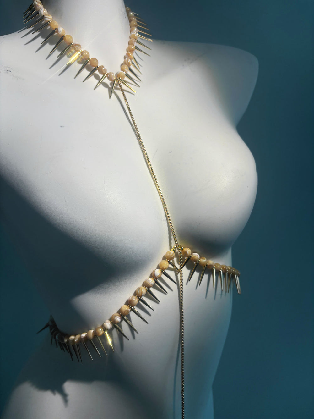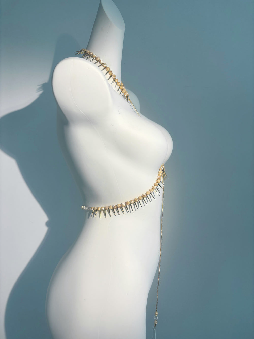 This is a striking masterpiece, handcrafted with precision and an eye for dedail. This bold accent body chain, featuring sharp metal and ethereal pearls, creates a dramatic and striking presence. The combination of spikes and lustrous pearls not only adds depth to your look but also radiates confidence and flair.
