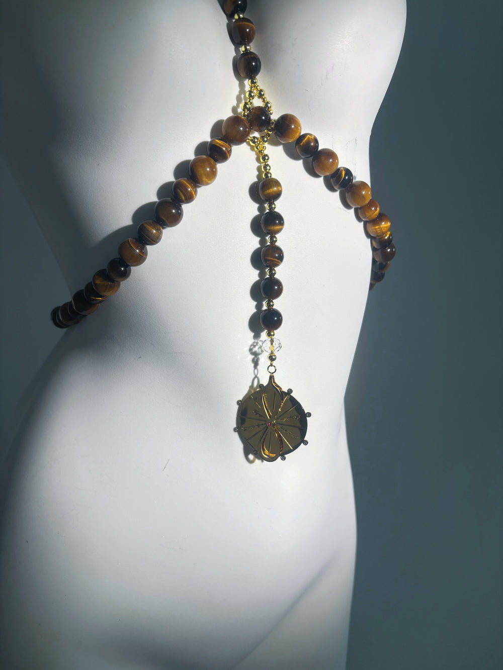 The "Golden Compass," a stunning handmade body chain crafted from high-quality natural Tiger Eye and yellow quartz stones. This luxurious jewelry piece is not only an exquisite accessory but also carries the power of Feng Shui, believed to attract good fortune in your life. The Tiger Eye Stone at its core is said to enhance your energy flow, boost confidence, and bring prosperity to your surroundings.
