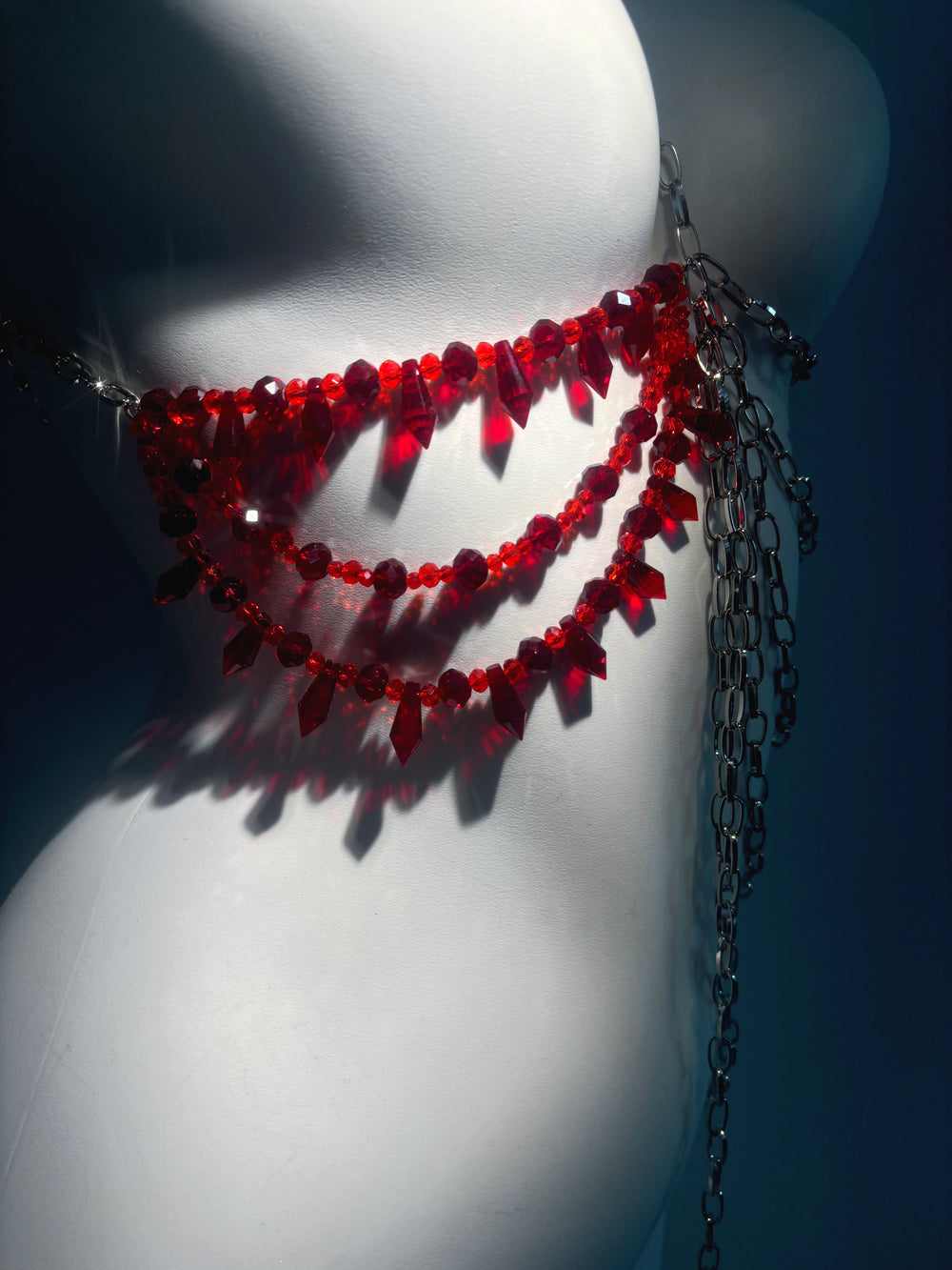 The AB side design, where the left and right are unbalanced looking, the hot red crystal like burning whereas the metal chain is like the reality that extinguish the desire deep down