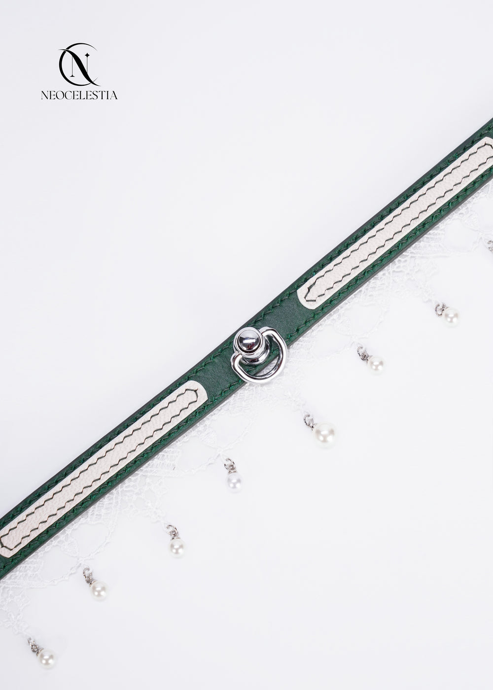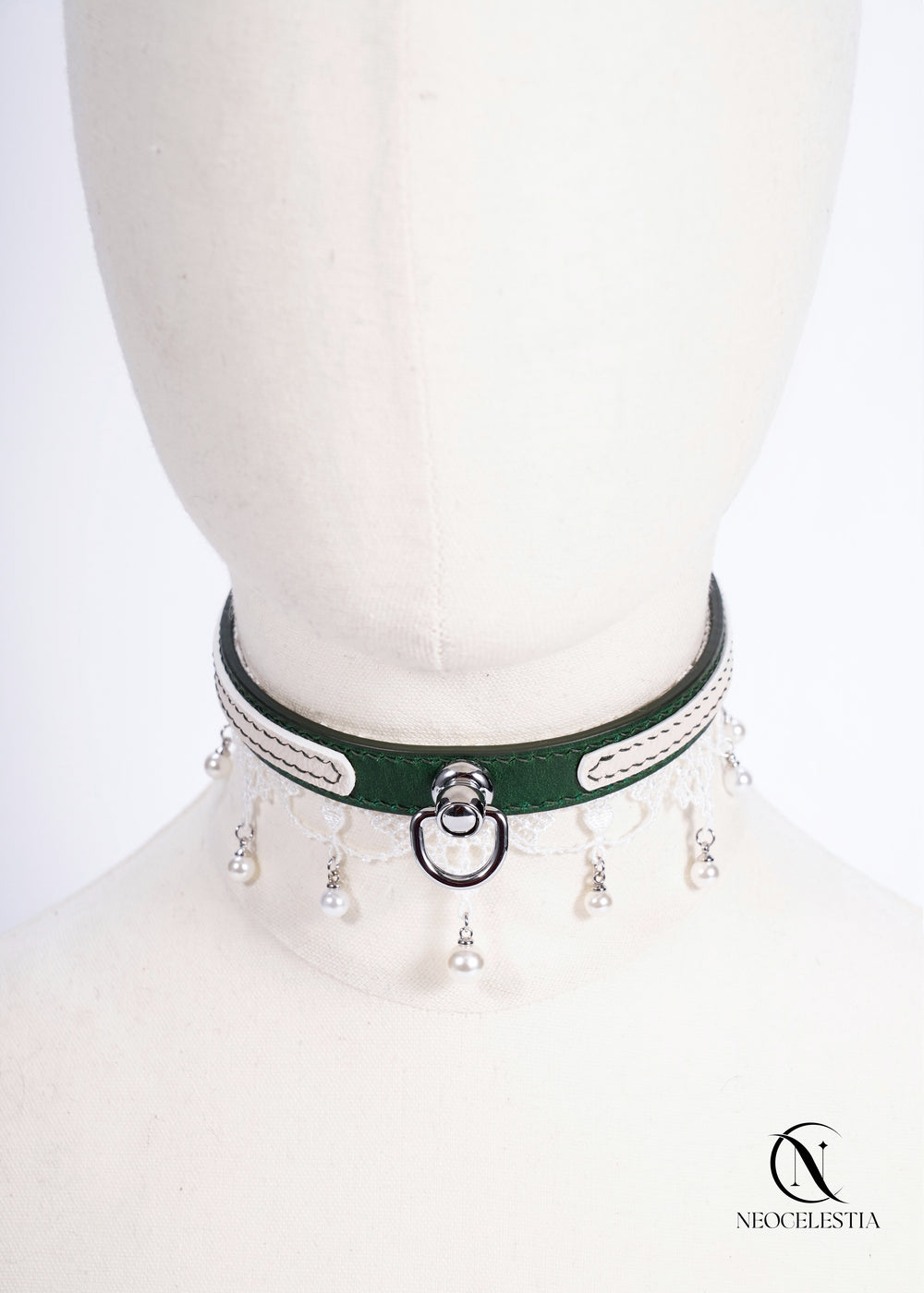 A whisper from a snow-laden forest. For the soul who finds magic in the quiet of winter, this choker is a delicate secret. The lush green band, adorned with hand-stitched white lace, trails a constellation of tiny pearls—like frozen dewdrops caught in an evergreen dream. Playful yet poised, it is a token for the eternal enchantress who dances in the snowfall. An irresistible heirloom for the heart that beats for joy and green.