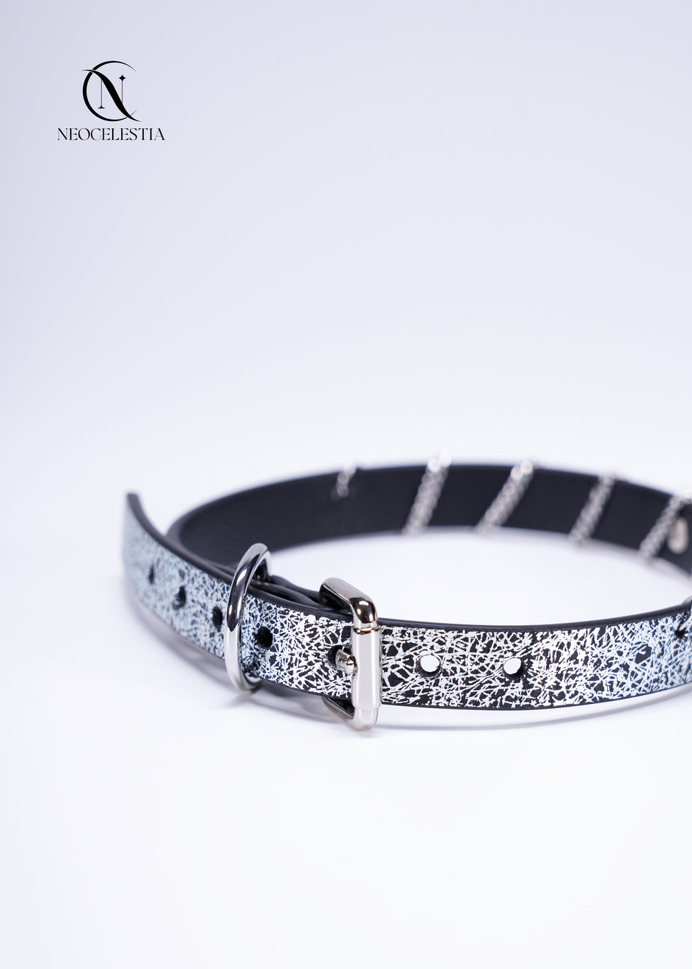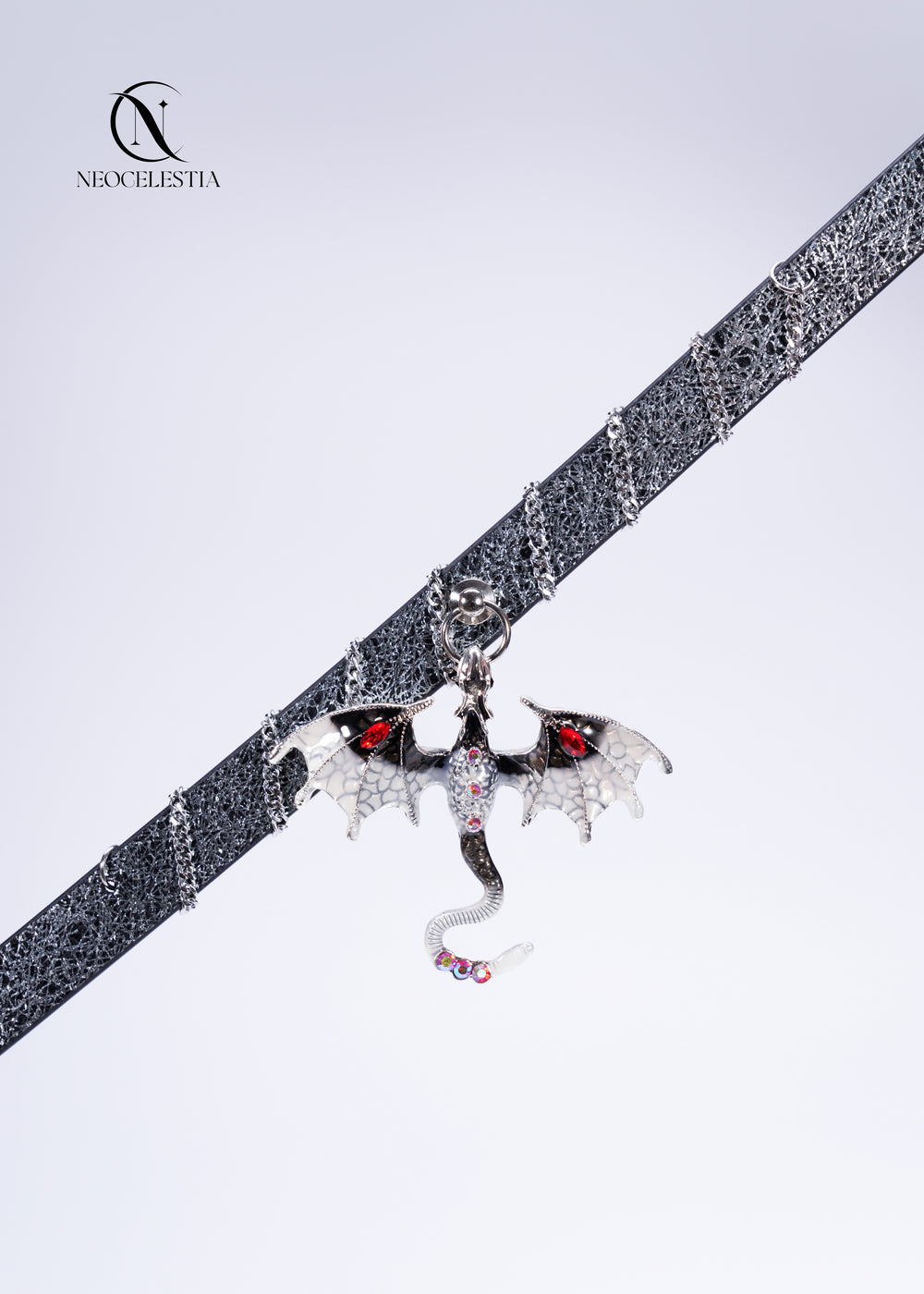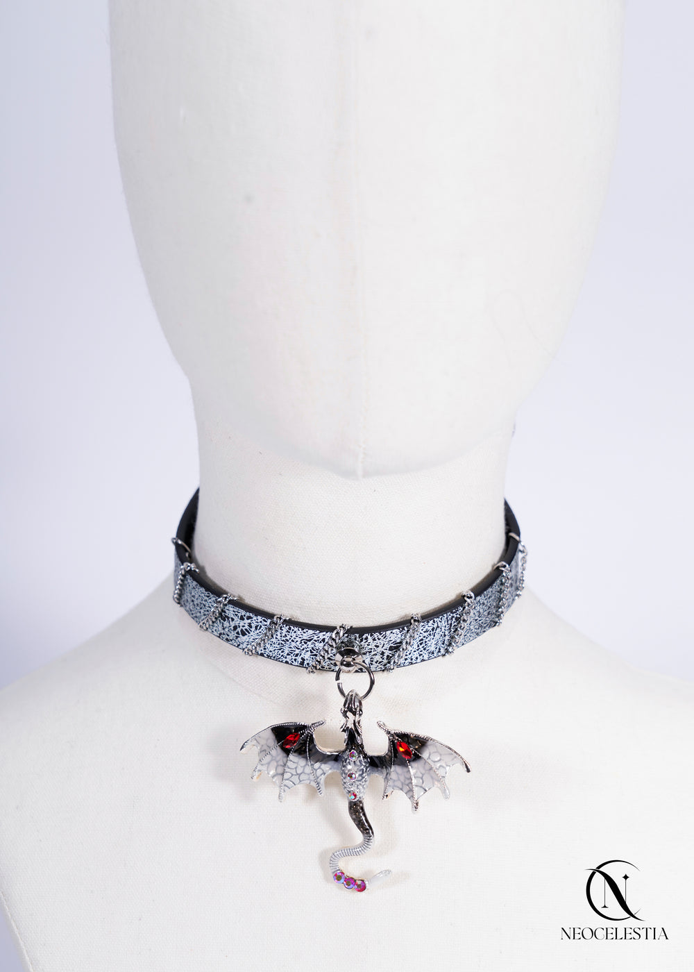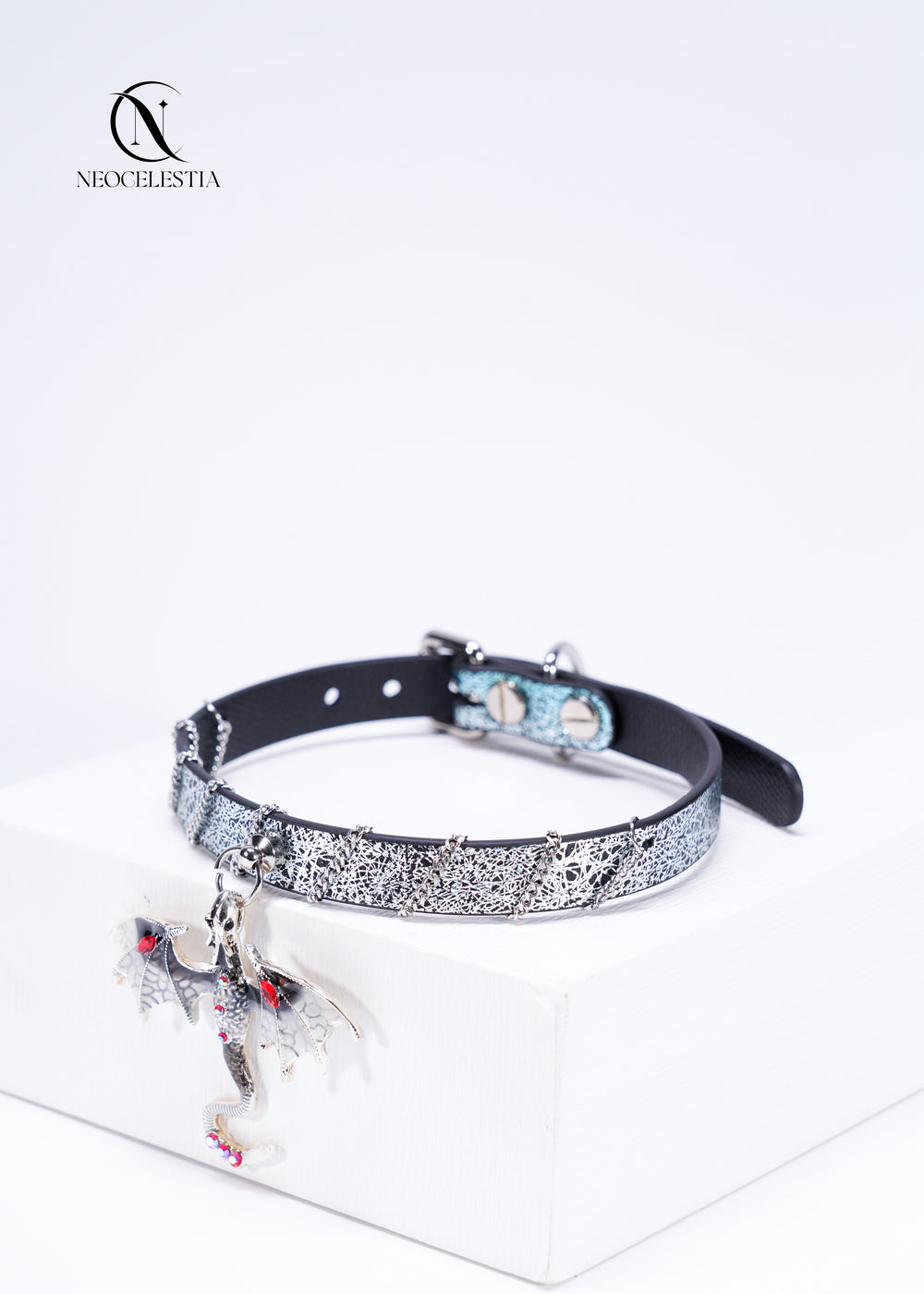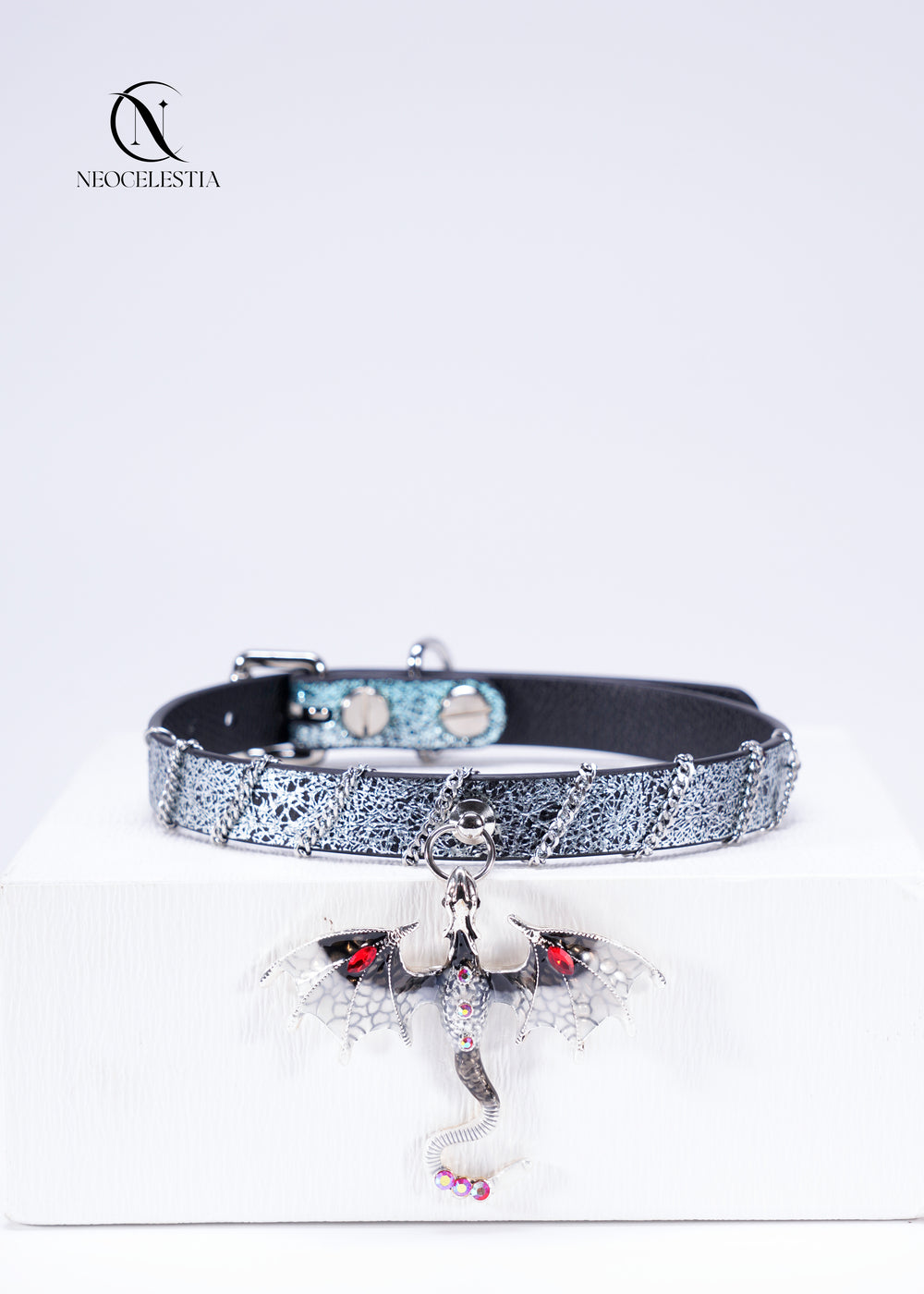 "Handcrafted leather choker with gilded chains, a tribute to the frostfire drakon's throe. 'I am the blood of the dragon,' she murmurs—bound by metal yet unyielding, her fire kindled in every curve of hand-tooled leather and agate eye. Wear her, and let the she-dragon's yearning to soar awaken your own untamed spirit."